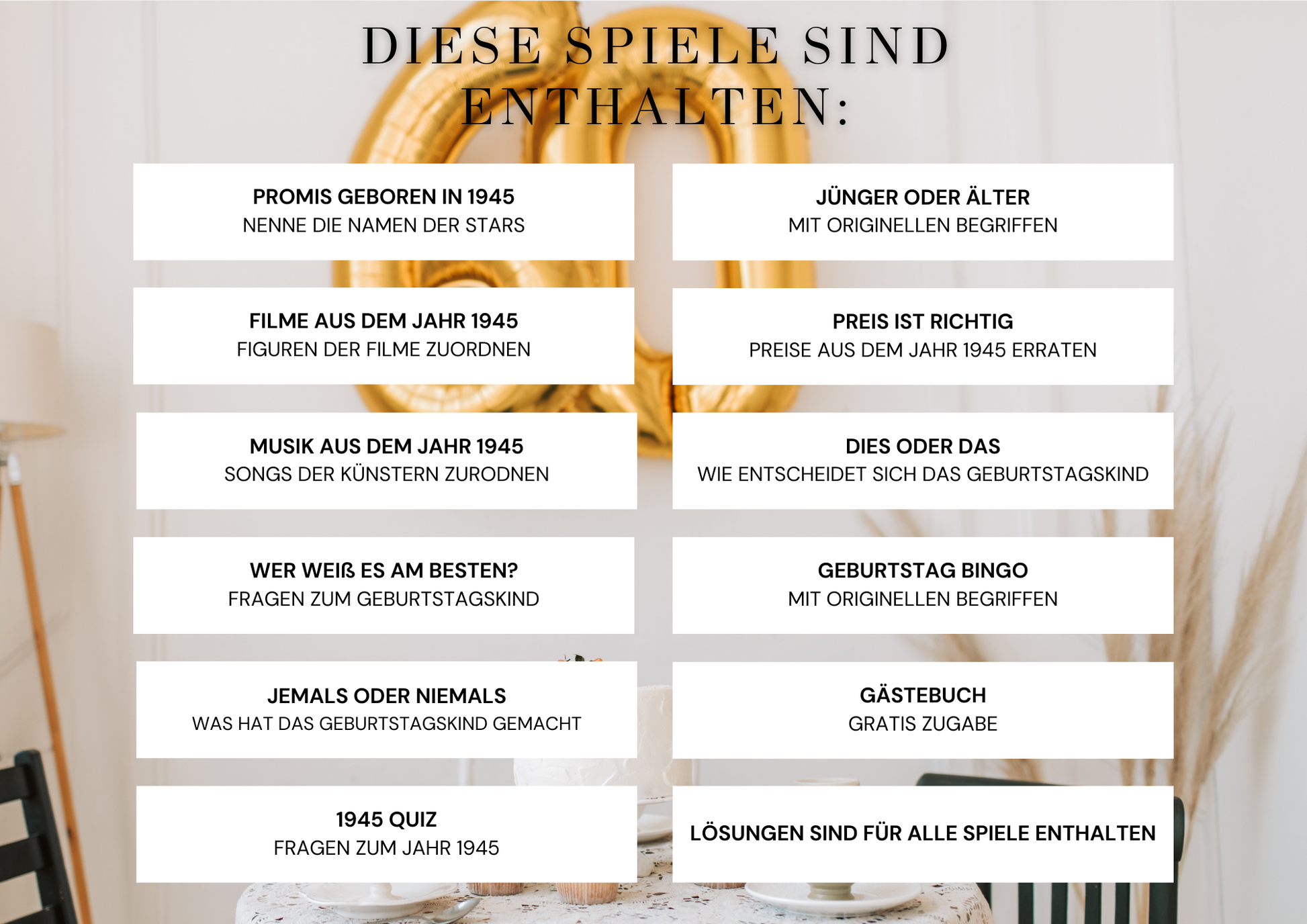 - Quiz & Bingo: Unterhaltsame Rätselfragen und Bingo-Karten zum Thema 1945 sorgen für beste Stimmung unter den Gästen und lassen den 80. Geburtstag zu einem unvergesslichen Erlebnis werden.