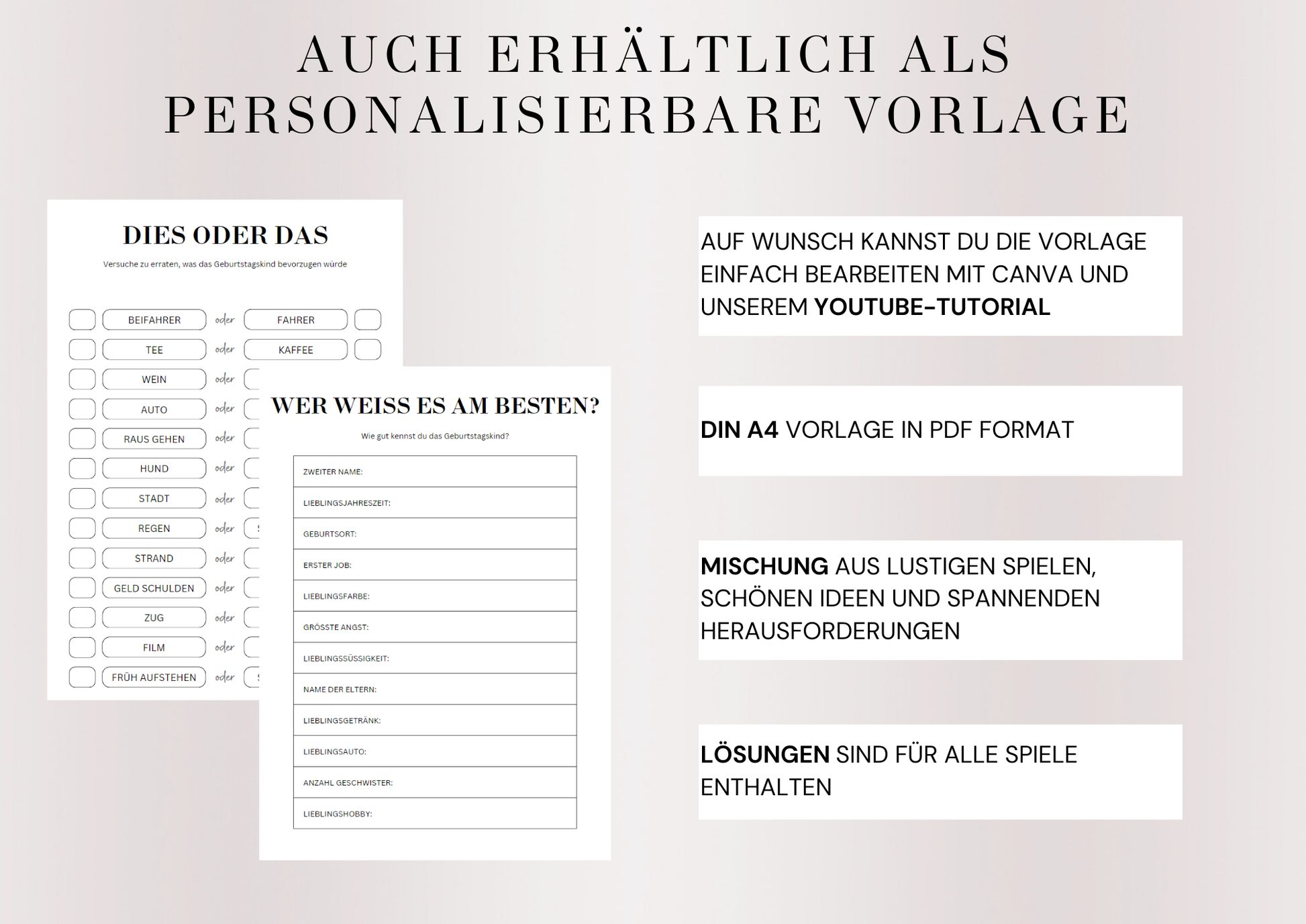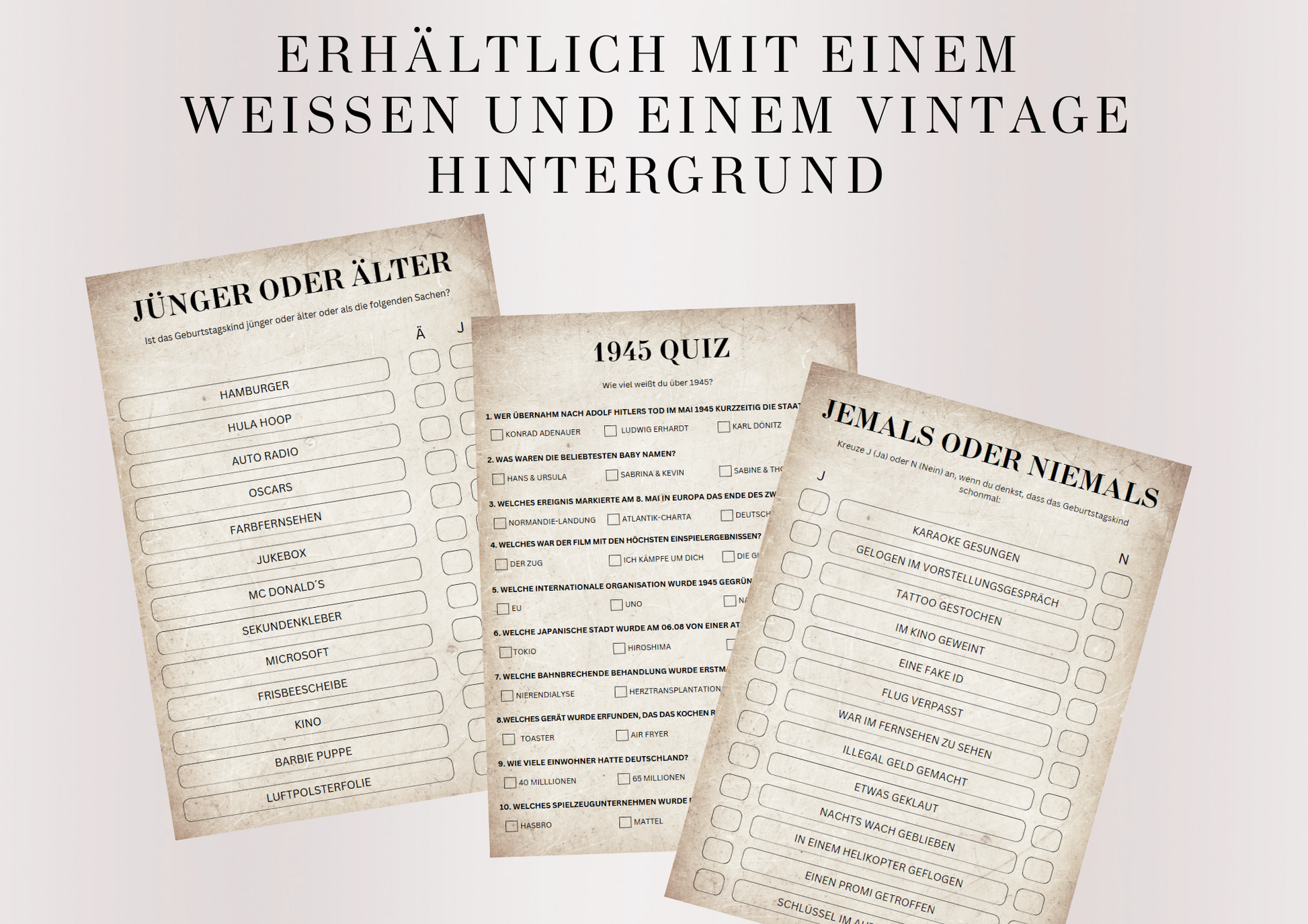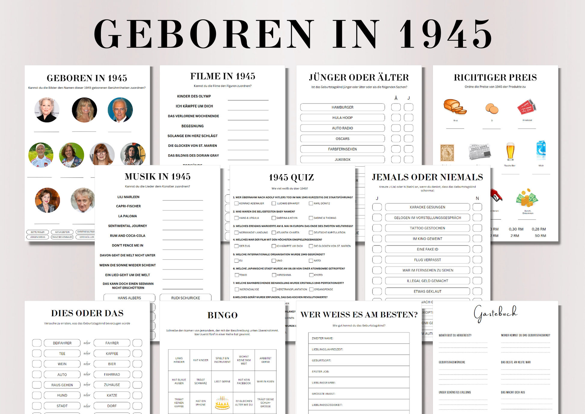 Du erhältst eine hochwertige PDF-Datei mit verschiedenen Spiel- und Quizseiten, die speziell auf das Geburtsjahr 1945 ausgerichtet sind – somit perfekt für den 80. Geburtstag im Jahr 2025.
