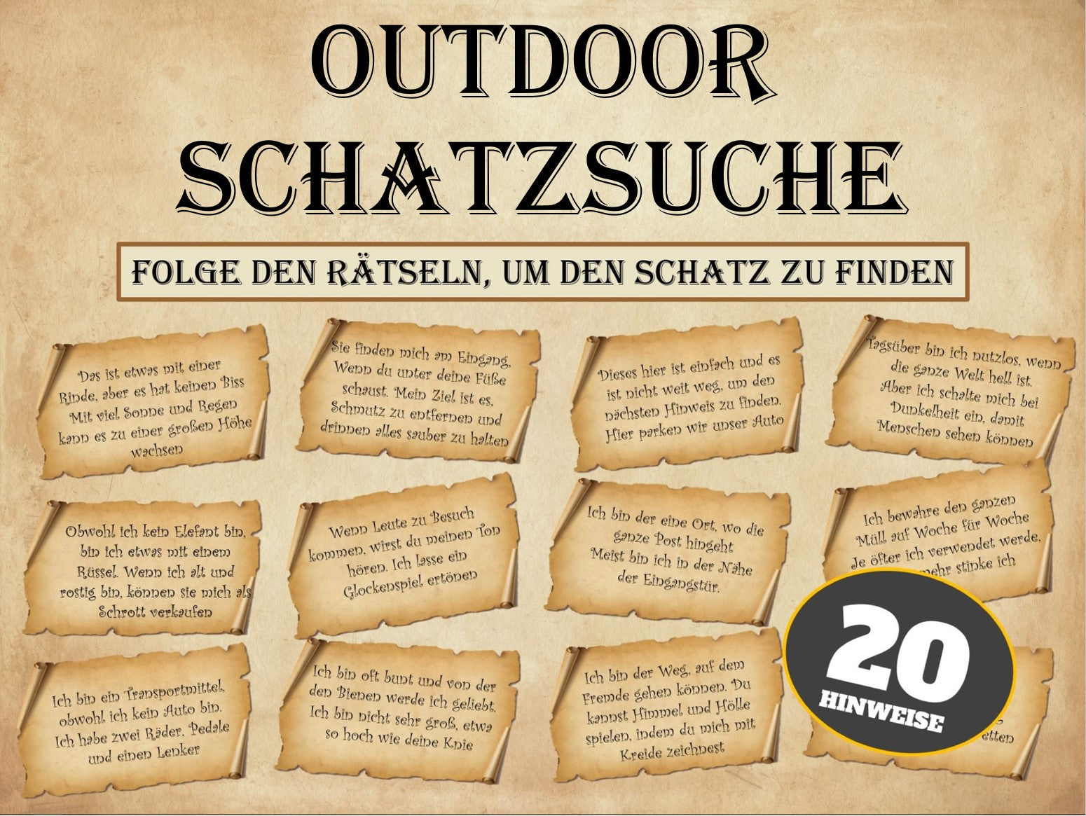 💰 Willkommen zur ultimativen Schatzsuche im Freien! Unsere Schnitzeljagd-Schatzsuche ist ein aufregendes Abenteuer, das für alle Kinder geeignet ist. Egal ob für Familienausflüge, Schulausflüge oder Geburtstagspartys, diese Schatzsuche ist der perfekte Weg, um gemeinsam Spaß zu haben und den Entdeckergeist zu wecken.